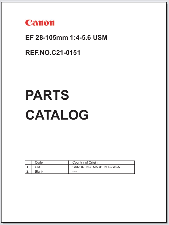 Digital presentation of an original Canon Lens EF 28-105mm 1:4-5.6 USM Parts Catalog. Service and repair manuals can help in dis-assembly of photography products during overhaul as well as restoration. Technical information such as timing, tools, and specifications may also be included in service manuals. Some manuals include schematics and wiring diagrams. Parts lists may also show exploded views. Additionally parts catalogs may list all parts made available for camera repair.