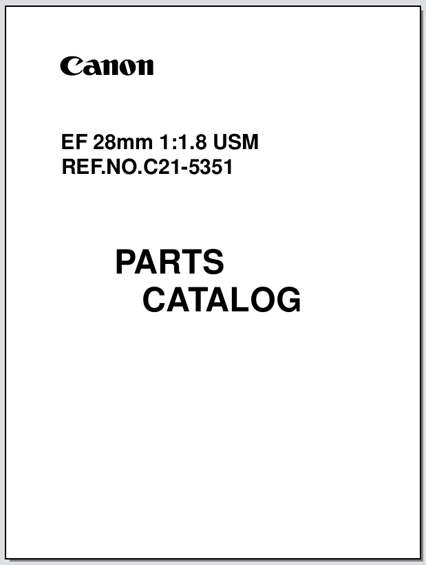 Digital presentation of an original Canon Lens EF 28mm 1:1.8 USM Parts Catalog. Service and repair manuals can help in dis-assembly of photography products during overhaul as well as restoration. Technical information such as timing, tools, and specifications may also be included in service manuals. Some manuals include schematics and wiring diagrams. Parts lists may also show exploded views. Additionally parts catalogs may list all parts made available for camera repair.