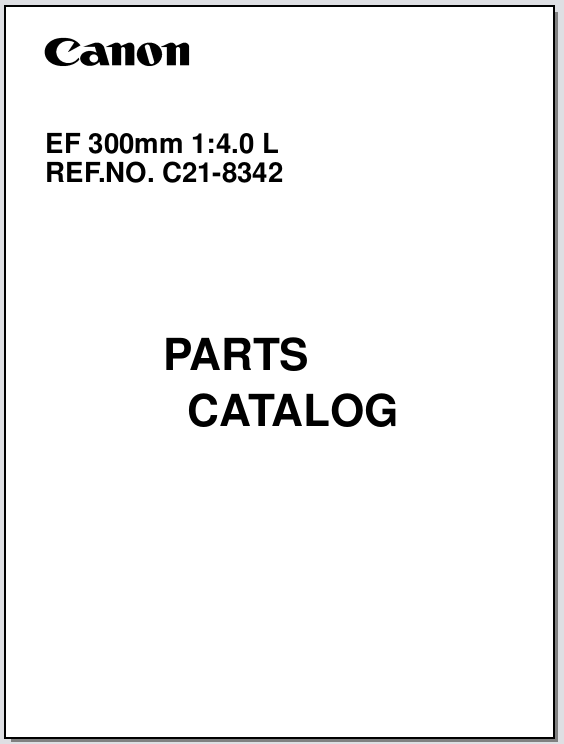 Digital presentation of an original Canon Lens EF 300mm 1:4.0L Parts Catalog. Service and repair manuals can help in dis-assembly of photography products during overhaul as well as restoration. Technical information such as timing, tools, and specifications may also be included in service manuals. Some manuals include schematics and wiring diagrams. Parts lists may also show exploded views. Additionally parts catalogs may list all parts made available for camera repair.