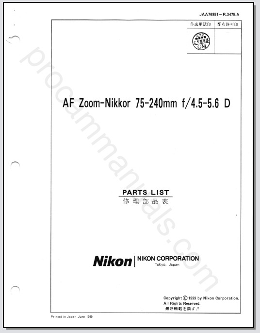 Digital presentation of an original Nikon AF Zoom-Nikkor 75-240mm f4.5-5.6 D JAA76851 Parts List. Service and repair manuals can help in dis-assembly of photography products during overhaul as well as restoration. Technical information such as timing, tools, and specifications may also be included in service manuals. Some manuals include schematics and wiring diagrams. Parts lists may also show exploded views. Additionally parts catalogs may list all parts made available for camera repair.