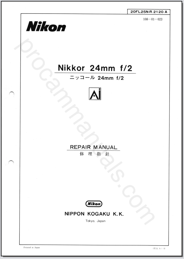 Digital presentation of an original Nikon Nikkor 24mm f2 Ai 20FL25N. Service and repair manuals can help in dis-assembly of photography products during overhaul as well as restoration. Technical information such as timing, tools, and specifications may also be included in service manuals. Some manuals include schematics and wiring diagrams. Parts lists may also show exploded views. Additionally parts catalogs may list all parts made available for camera repair.