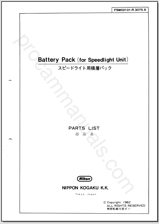 Digital presentation of an original Nikon Speedlight Unit Battery Pack FSW02101 (Parts List). Service and repair manuals can help in dis-assembly of photography products during overhaul as well as restoration. Technical information such as timing, tools, and specifications may also be included in service manuals. Some manuals include schematics and wiring diagrams. Parts lists may also show exploded views. Additionally parts catalogs may list all parts made available for camera repair.