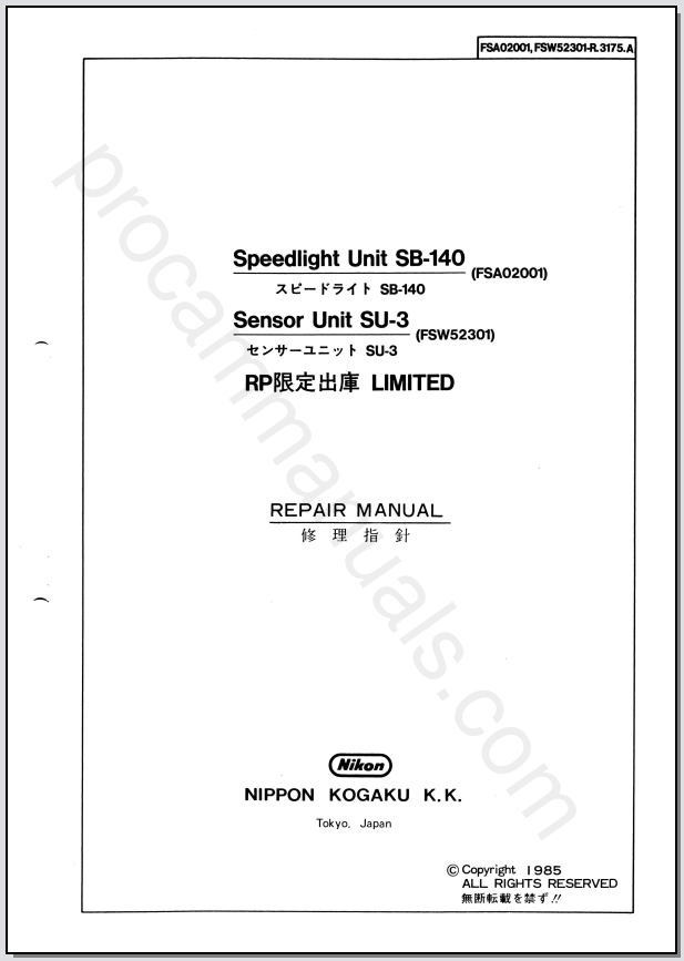 Digital presentation of an original Nikon Speedlight Unit SB-140 & Sensor Unit SU-3 FSA02001, FSW52301. Service and repair manuals can help in dis-assembly of photography products during overhaul as well as restoration. Technical information such as timing, tools, and specifications may also be included in service manuals. Some manuals include schematics and wiring diagrams. Parts lists may also show exploded views. Additionally parts catalogs may list all parts made available for camera repair.